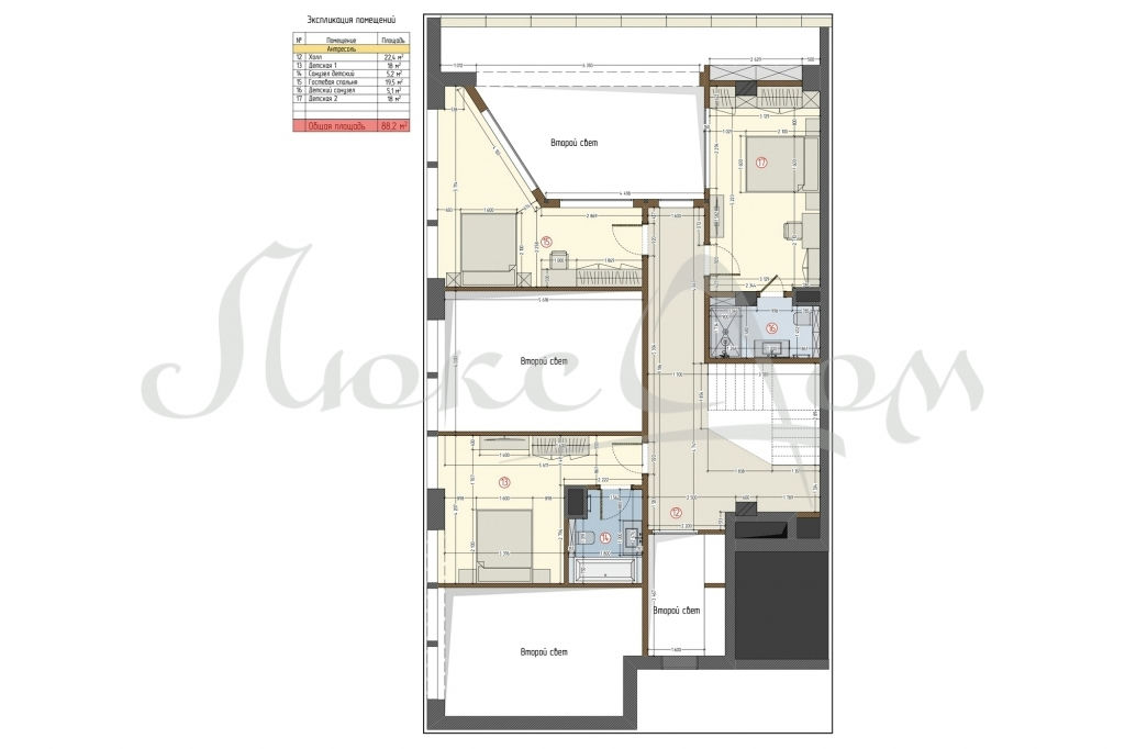 2й уровень: 2 детские спальни с ванными комнатами, кабинет.
